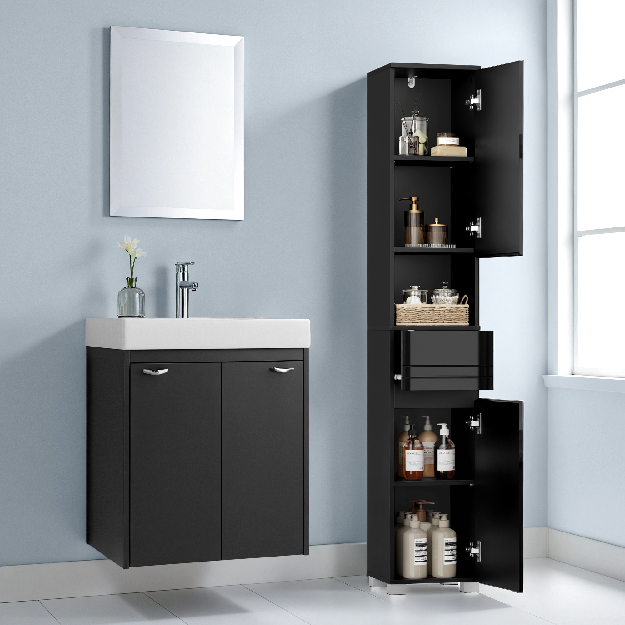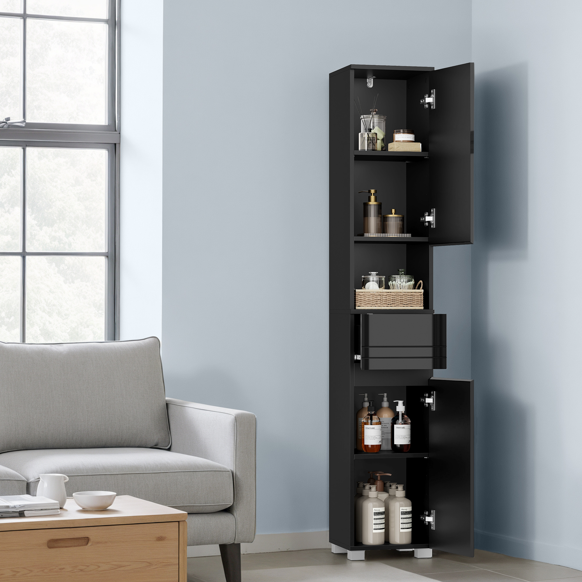 Bathroom Cabinet 30×30×170 cm – Schmaler Badezimmerschrank mit Schublade & Regalen