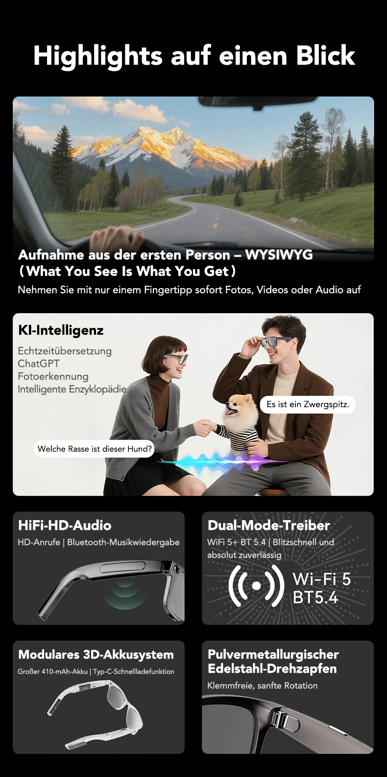 2025 Smart AI Brille – Echtzeit Übersetzung, 160 Sprachen, 2K Aufnahme, FPV Video, Wireless Calling