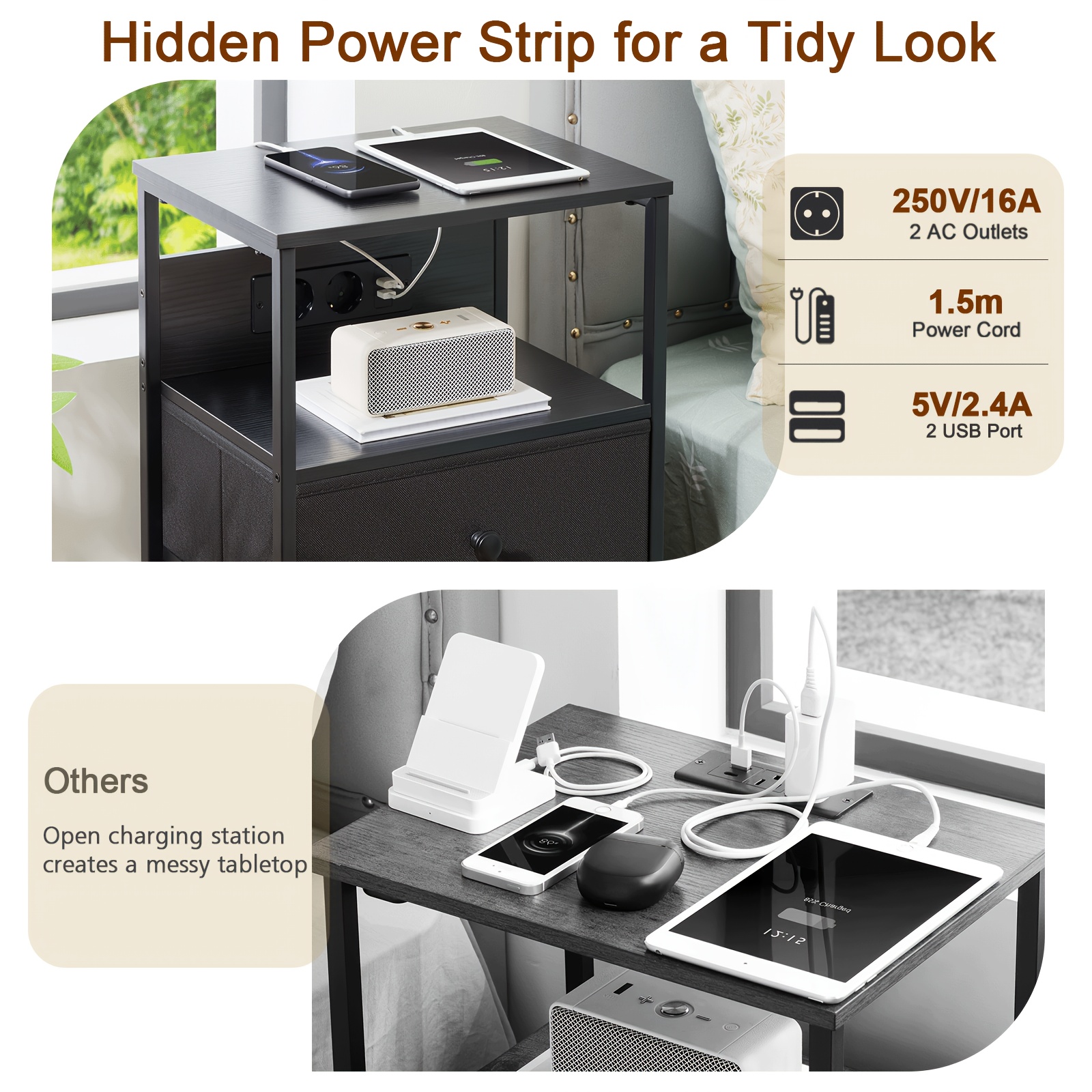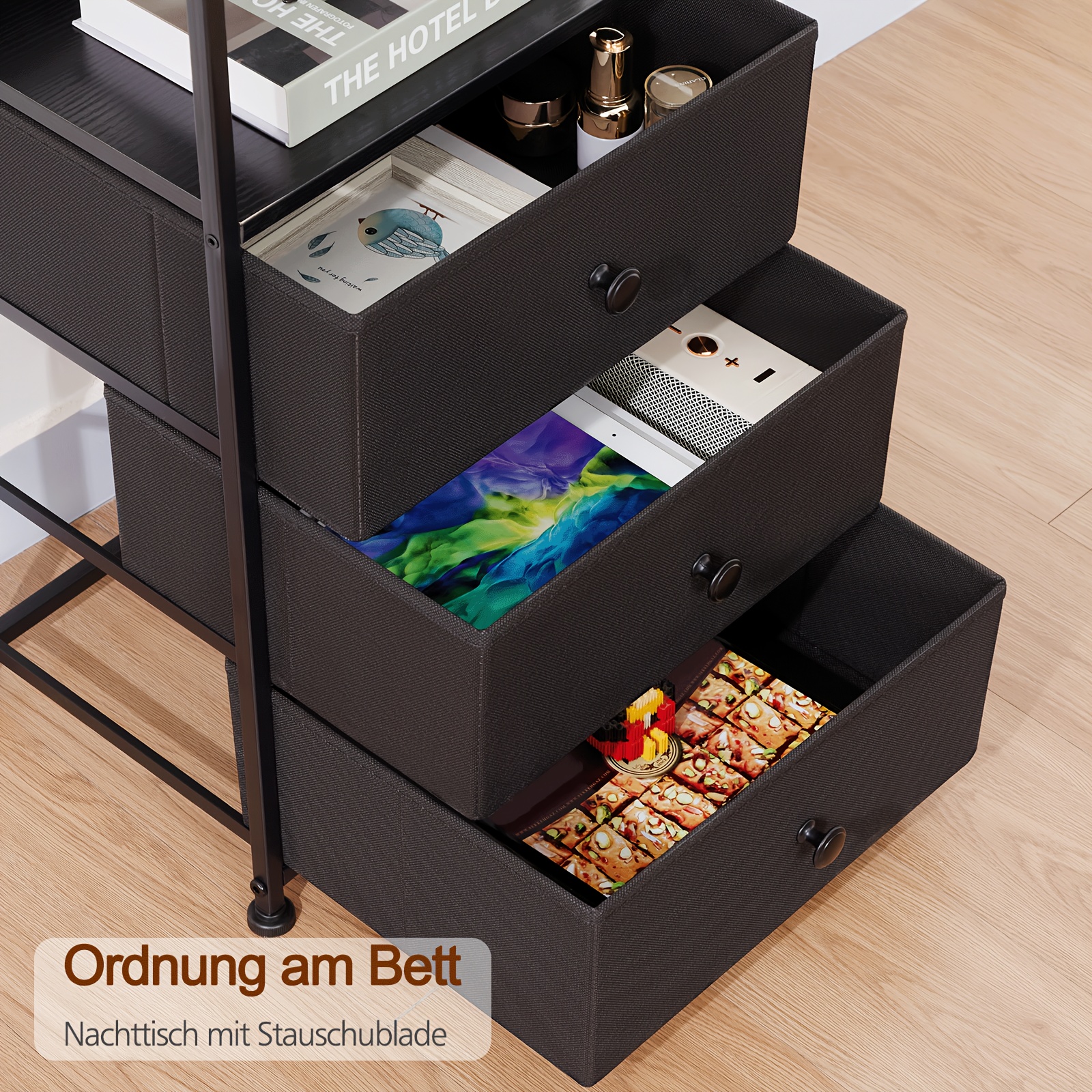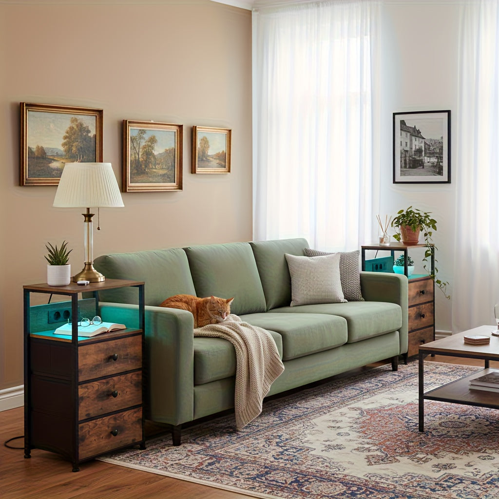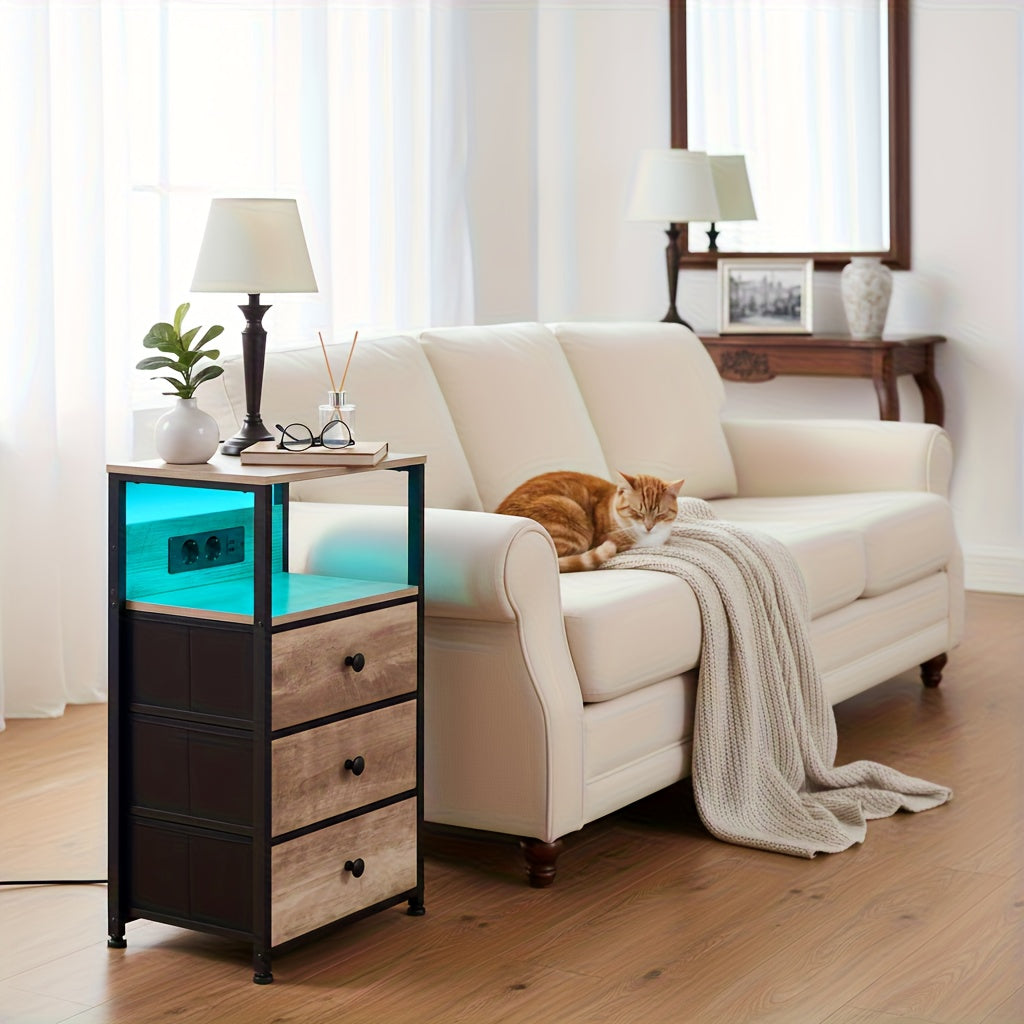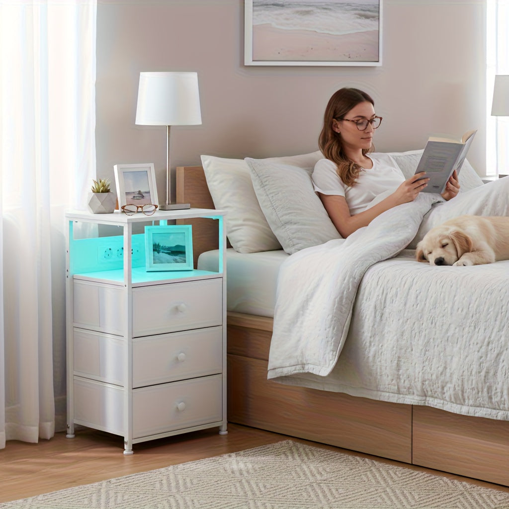 AMHANCIBLE 2er Set Nachttische mit 3 Stoffschubladen, LED-Beleuchtung & Ladefunktion – Modern & Praktisch