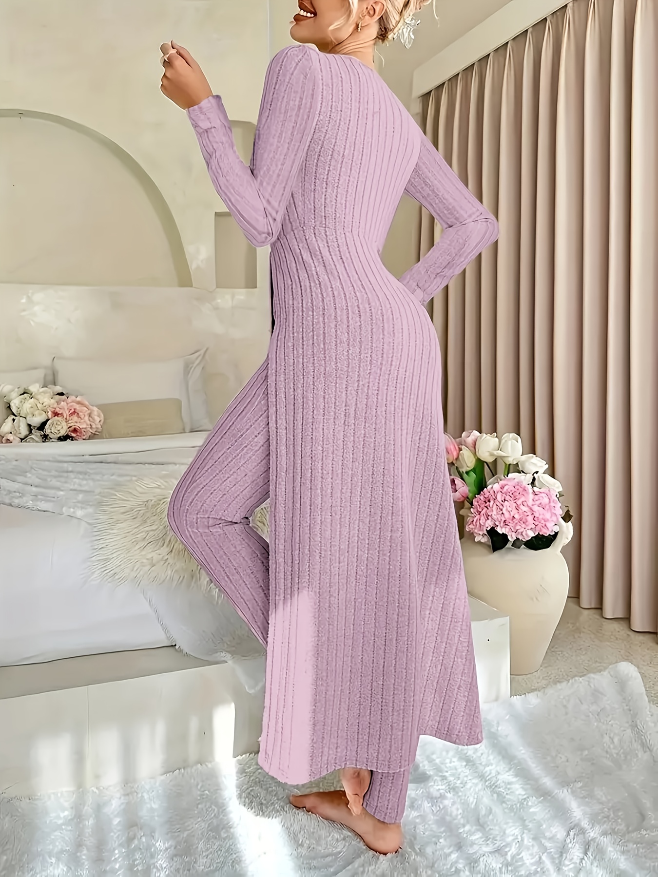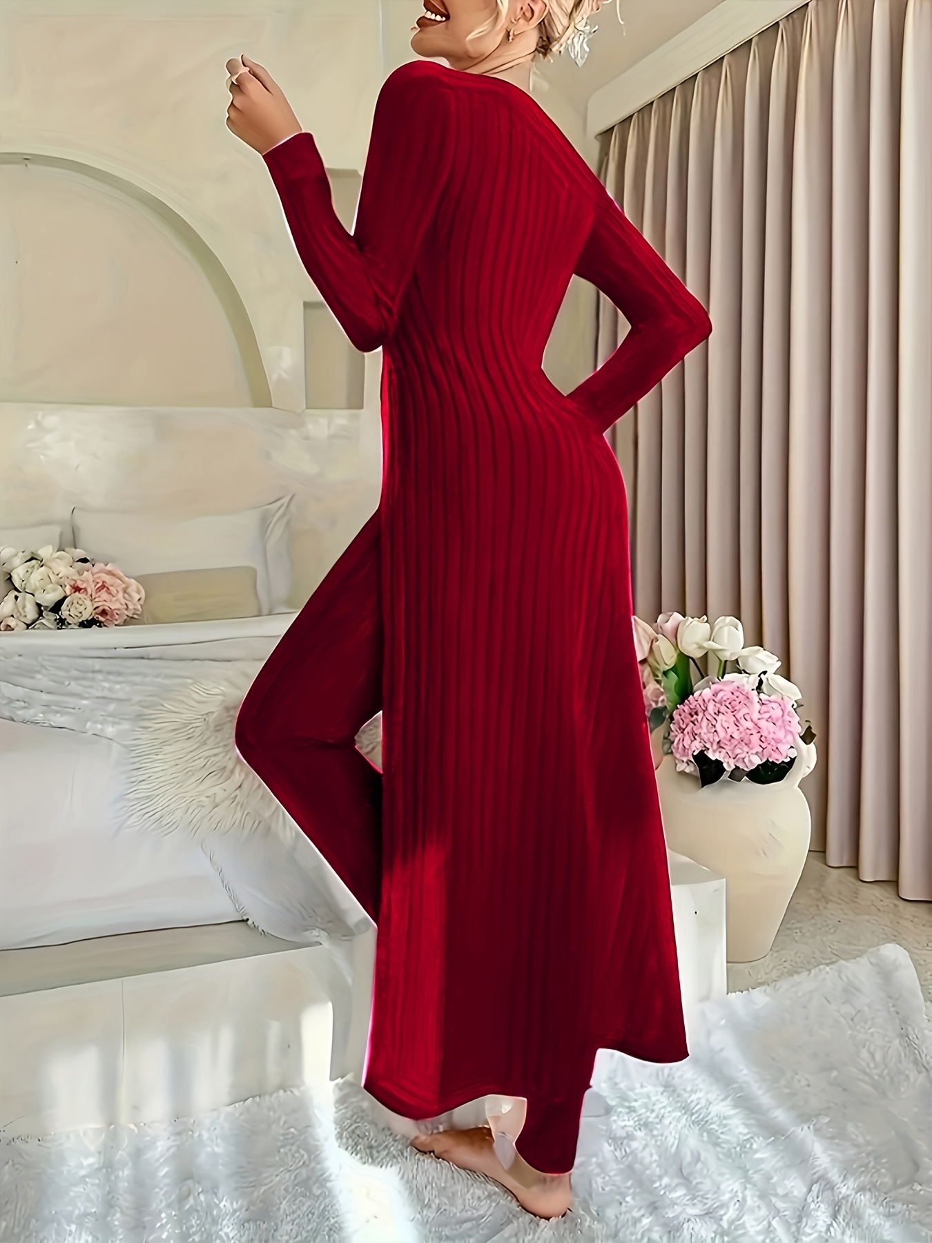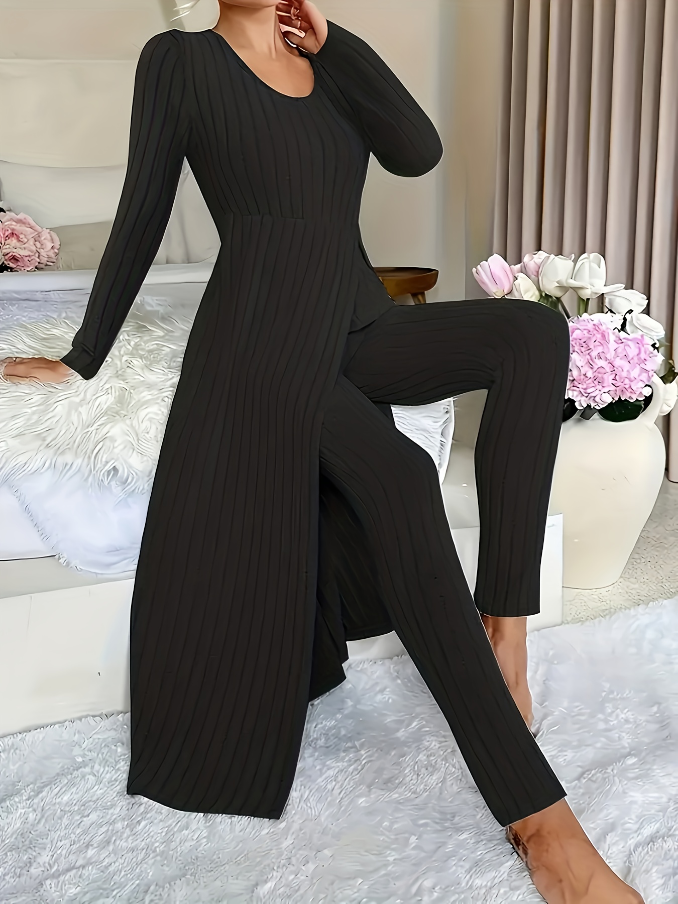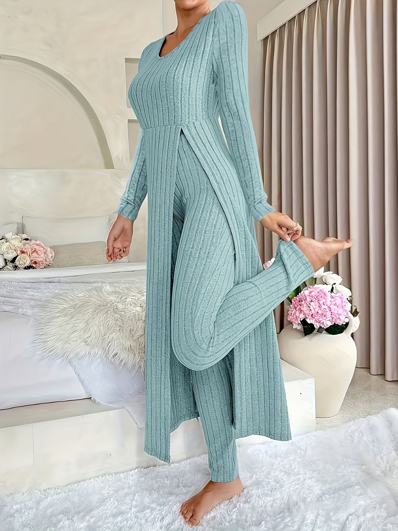 1 Clothes 1 Pants Casual Loose Long Sleeve Dress & Pants Set – Soft Fleece, 3D Stripe Design, hoher Schlitz, Crew Neck, bequem für Alltag & Zuhause