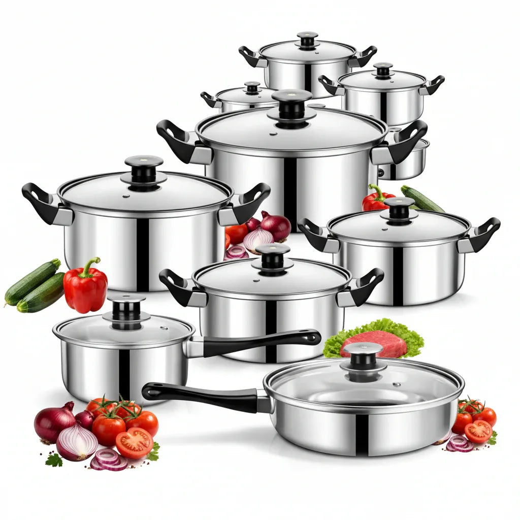 Dieses hochwertige Kochgeschirr-Set aus Edelstahl vereint Funktionalität, Langlebigkeit und zeitloses Design – ideal für jeden Haushalt.