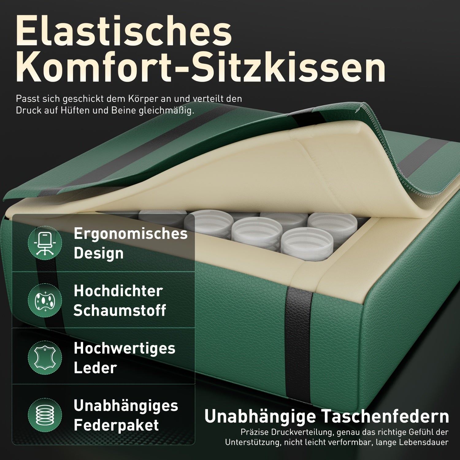 Die Oberfläche des Gaming-Stuhls besteht aus weichem, atmungsaktivem PU-Leder, das sich mit einem weichen Tuch leicht reinigen lässt und wieder wie neu aussieht. Der Sitz ist mit hochdichtem Memory-Schaum und unabhängigen Taschenfedern gefüllt. Diese Kombination aus flexibler Polsterung bietet eine dynamische Unterstützung, die sich deinem Sitzverhalten anpasst – auch bei längerer Nutzung bleibt der Komfort erhalten.