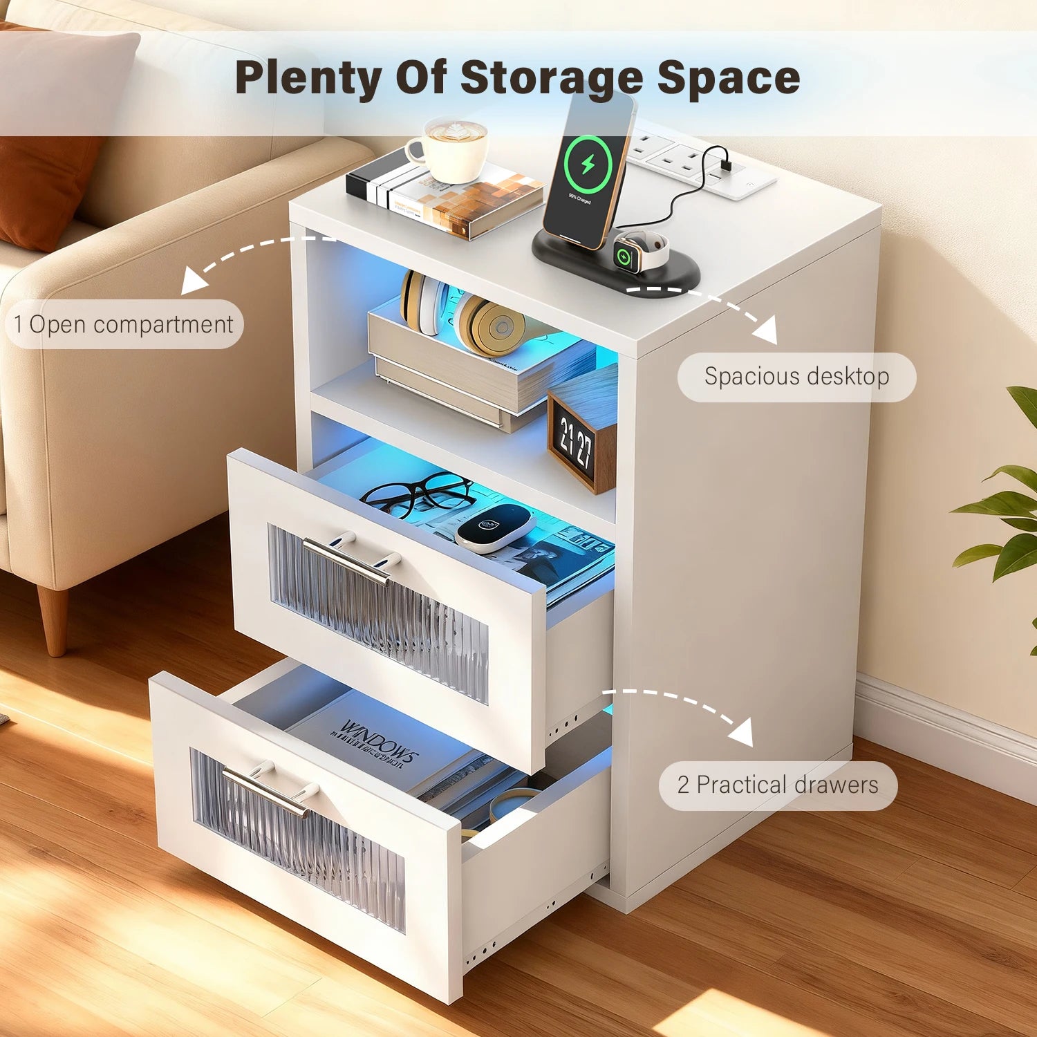 Verwandeln Sie Ihr Schlafzimmer mit diesem stilvollen LED-Nachttisch, der Funktionalität und modernes Design perfekt vereint. Mit 2 geräumigen Schubladen und integrierter Ladestation haben Sie alles Wichtige griffbereit.