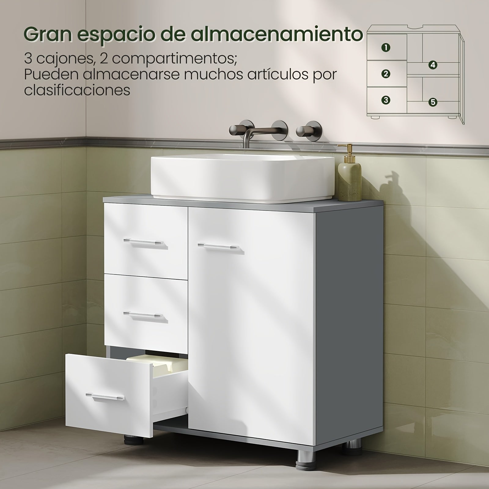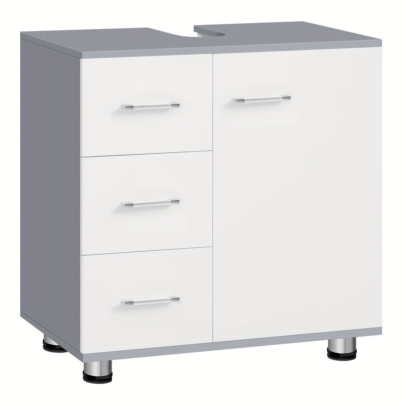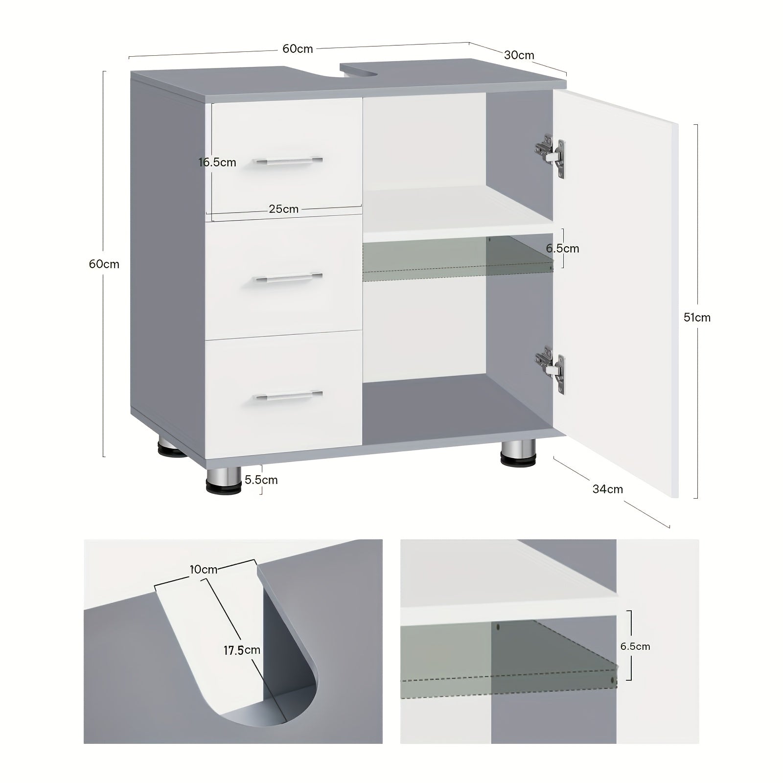 Waschtisch-Unterschrank 60x60x30cm Weiß-Grau - 3 Schubladen & 2 Fächer