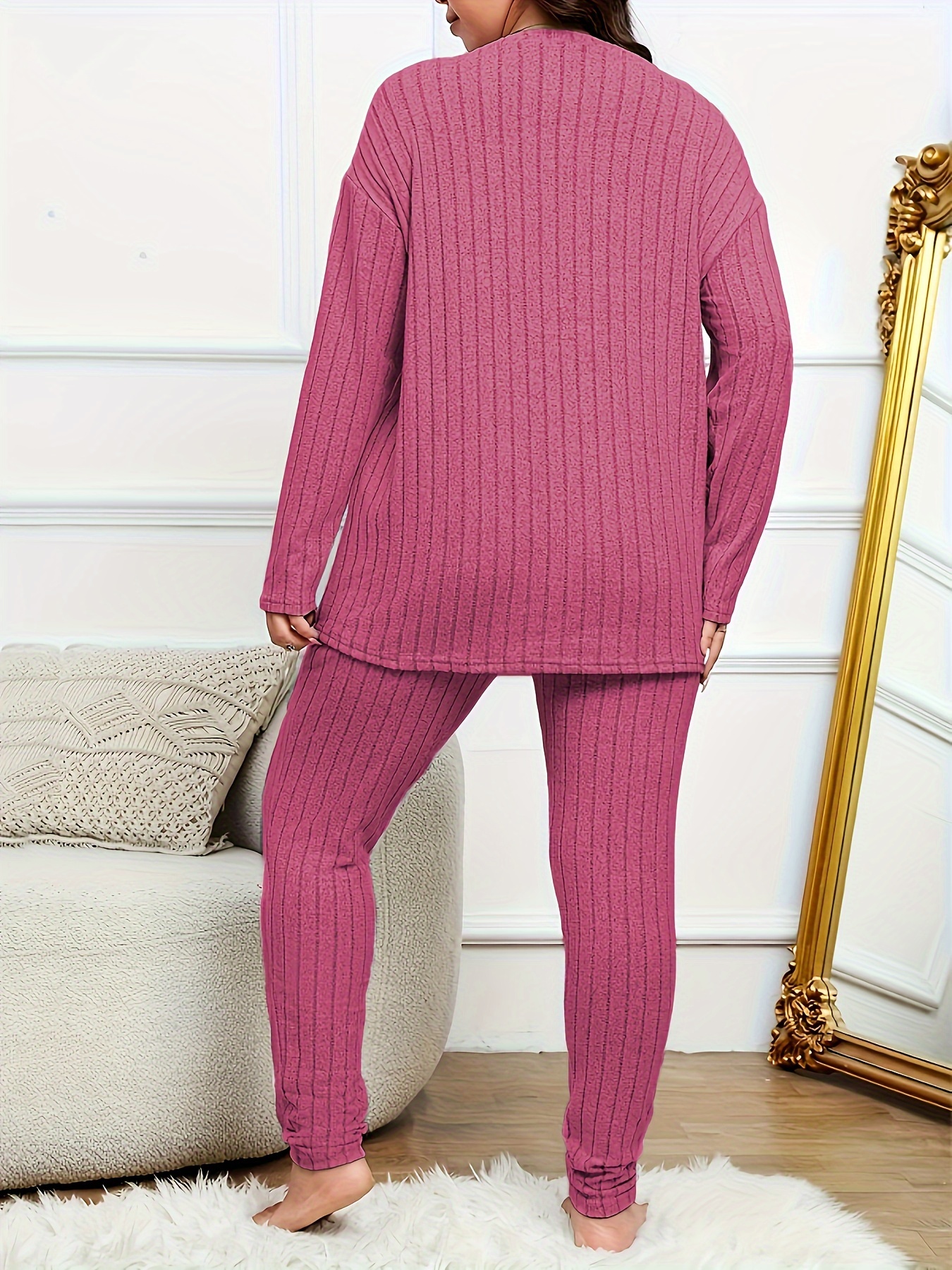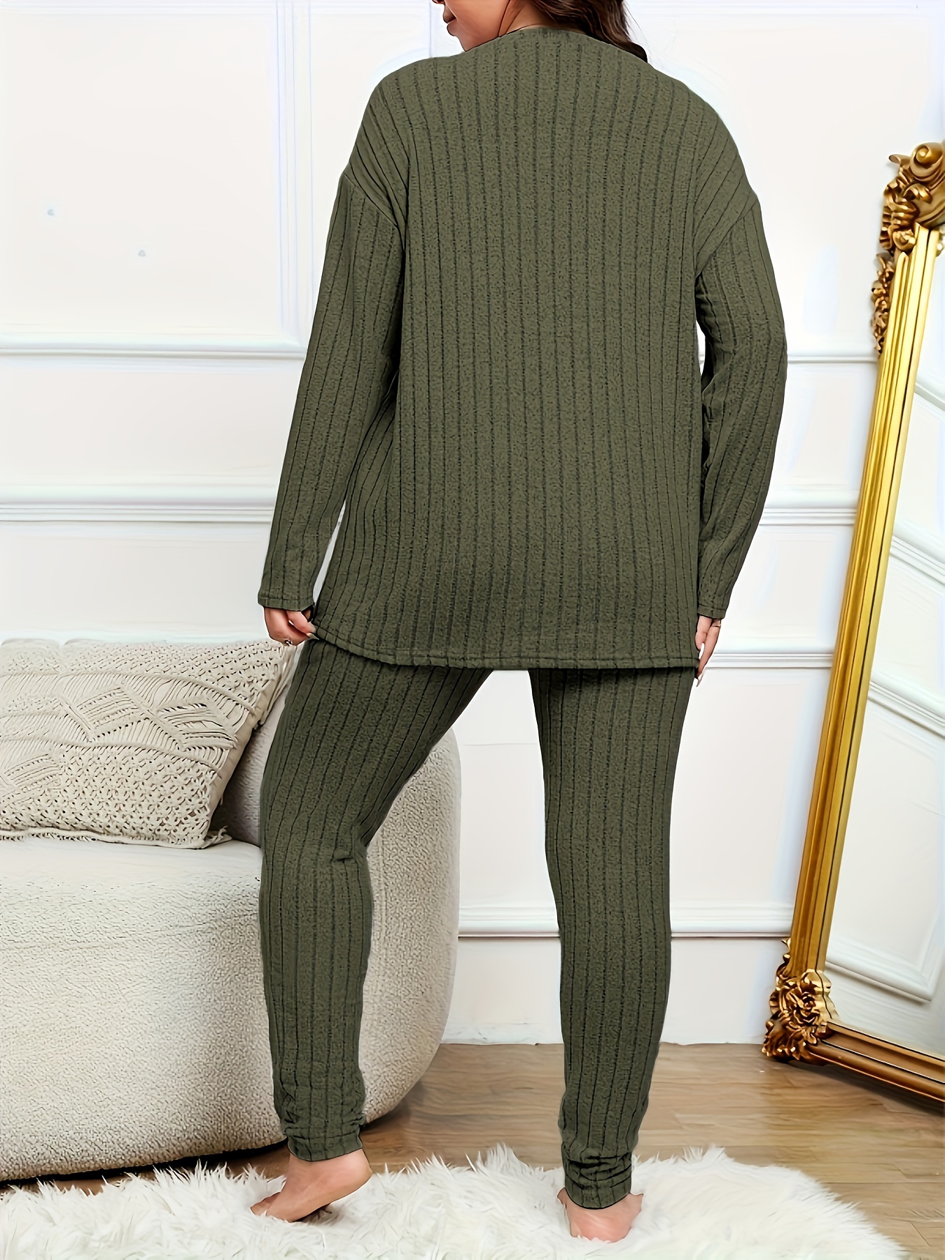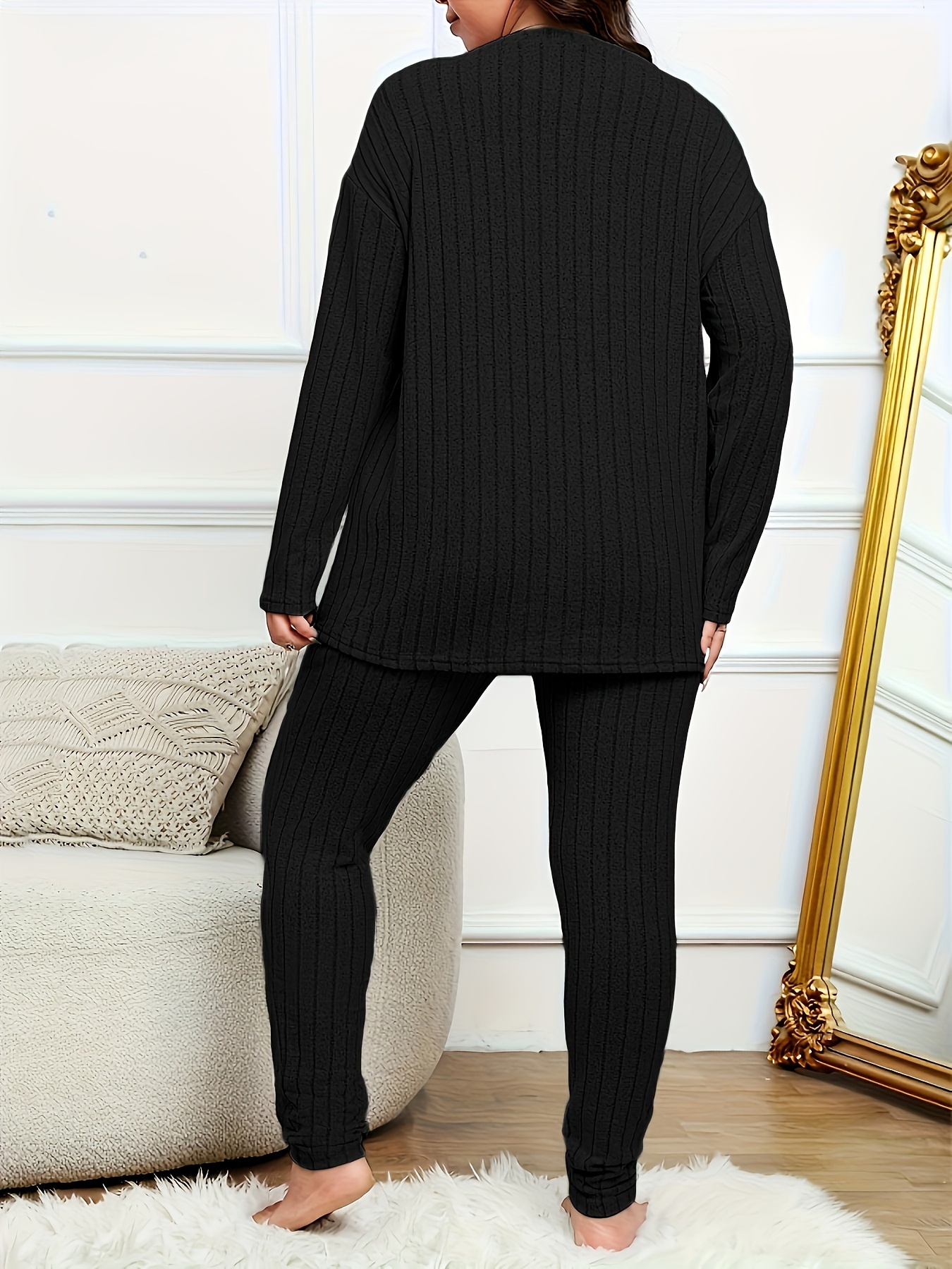 Women's Casual Lounge Set 2‑teilig – Plus Size, Langarm Ribbed Top & Leggings, Komfort & Stil
