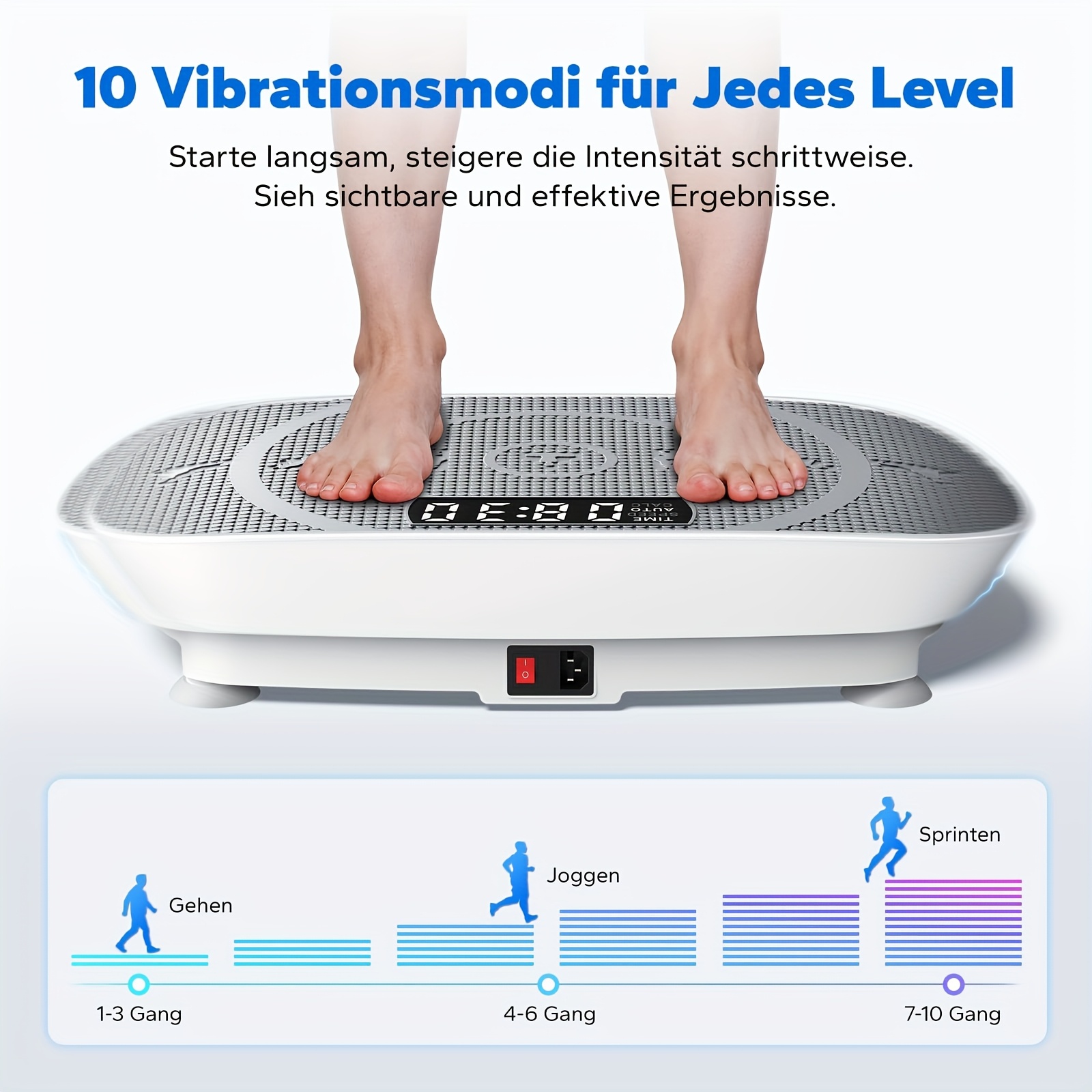 Diese kompakte, weiße Vibrationsplatte bietet ein leises, effizientes Ganzkörpertraining für Zuhause. Ideal für Muskelstraffung, Core-Stärkung und Balance-Training. Das rutschfeste Silikonpad sorgt für sicheren Stand, während LED-Display und Fernbedienung die Bedienung besonders einfach machen.