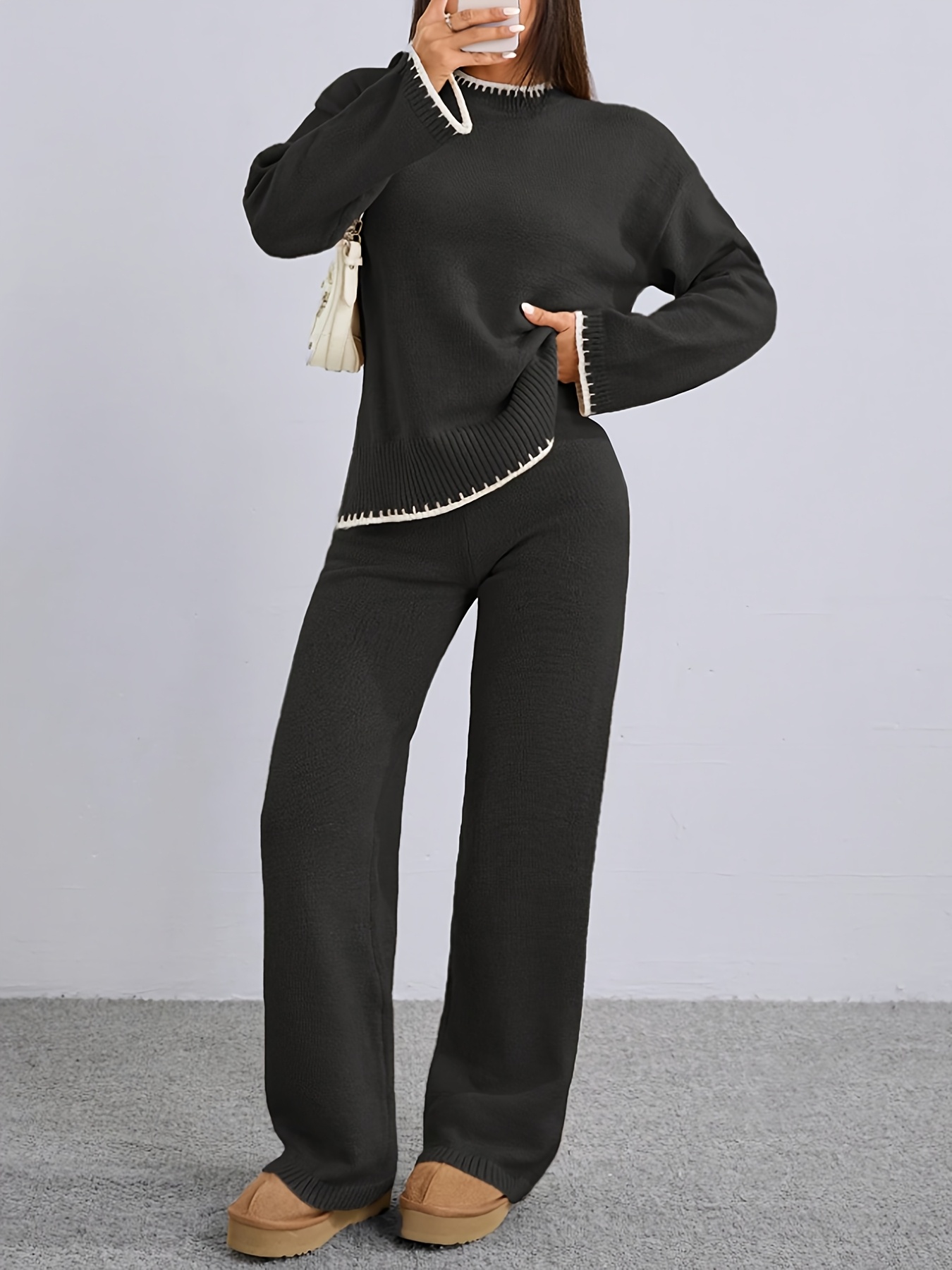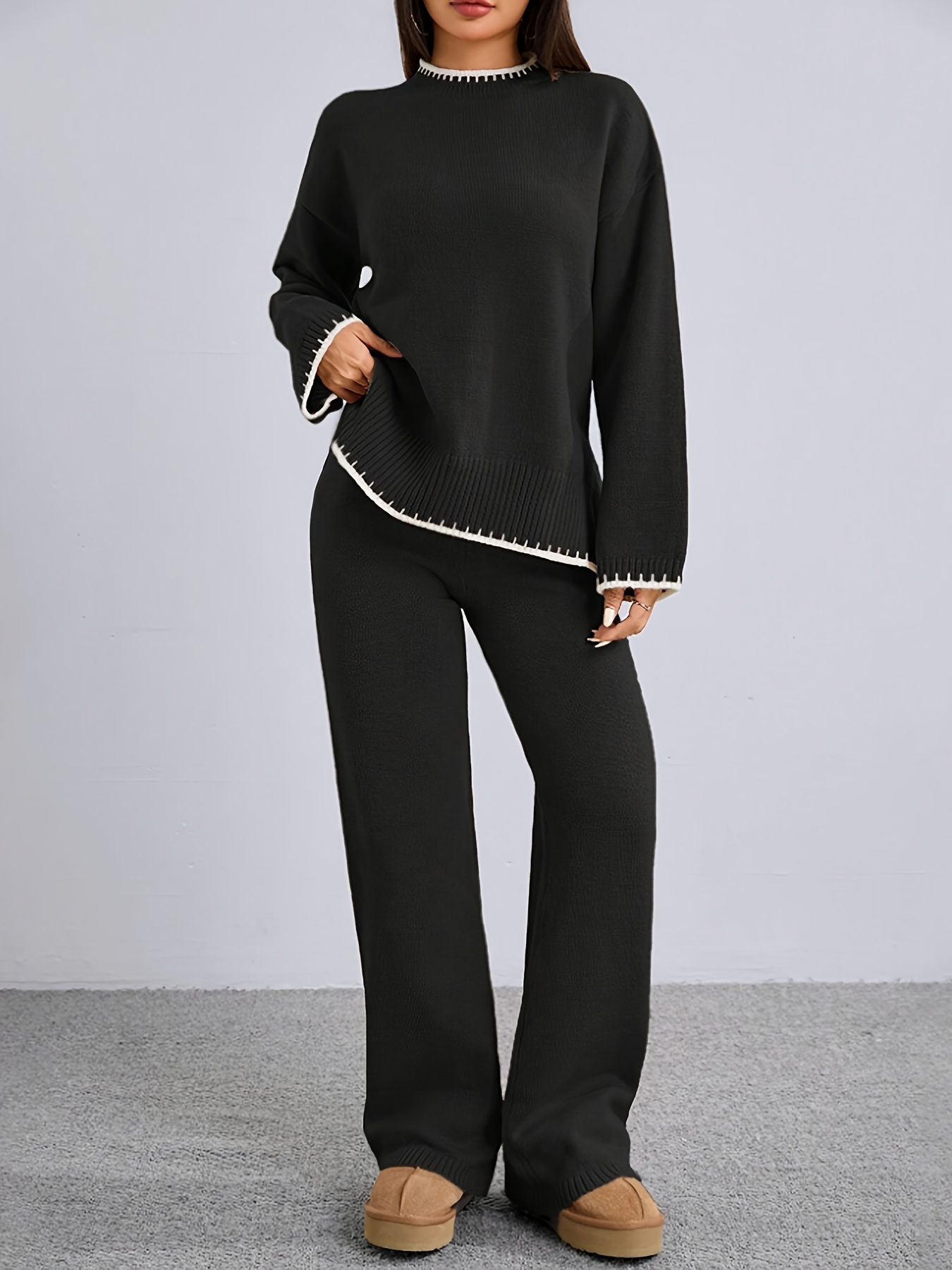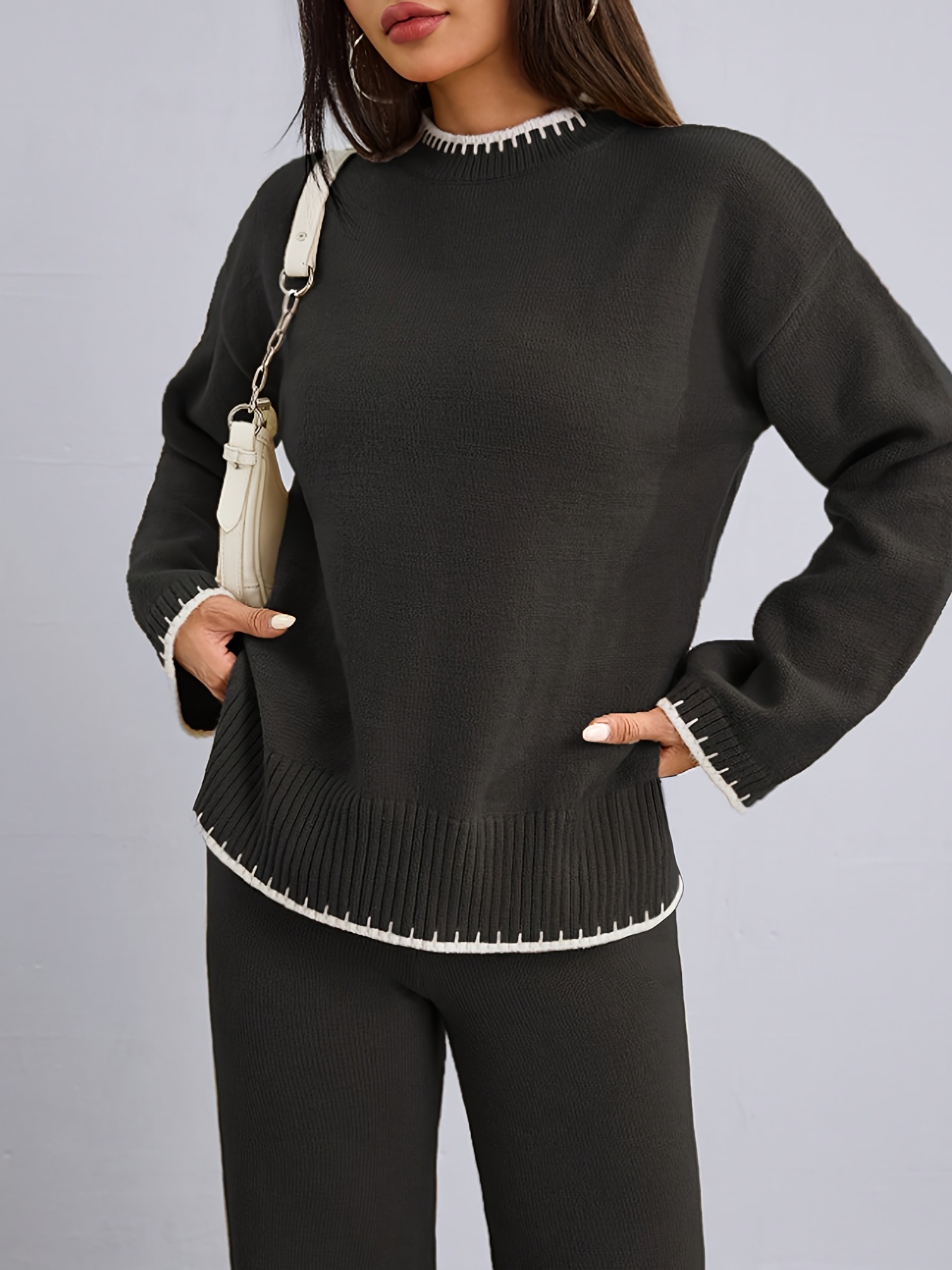 Zweiteiler Damen ZD0505906 – Elegantes Set mit Rundhals Pullover & Hose, Kontrastdesign, Frühling bis Winter